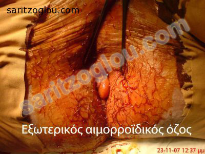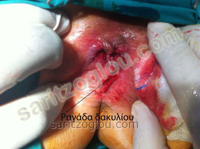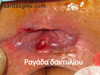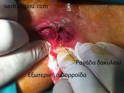 Ραγάδα δακτυλίου στην 6η ώρα του πρωκτού και εξωτερικός αιμορροϊδικός όζος.