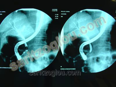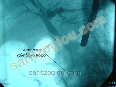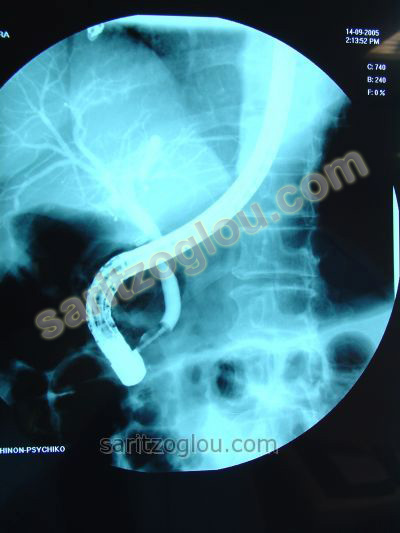 Ασθενές με αποφρακτικό ίκτερο και πυώδη χολαγγειίτιδα, διαγνώστηκε με την μέθοδο της ERCP, η απόφραξη του χοληδόχου πόρου από καρκίνο της κεφαλής παγκρέατος και έγινε τοποθέτηση μεταλλικού stent. Ακτινοσκοπική εικόνα.