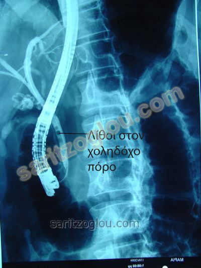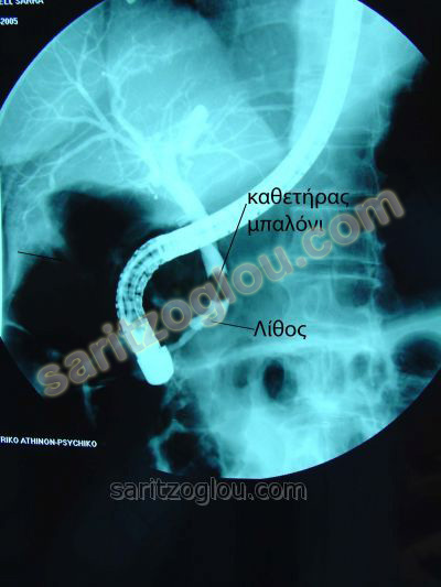 Σε ασθενή που πάσχει από χολαγγειίτιδα, διαγνώστηκε με την μέθοδο της ERCP, η παρουσία πέτρας στον χοληδόχο πόρο, η οποία και αφαιρείται με ειδικό καθετήρα τύπου μπαλόνι. Ακτινοσκοπική εικόνα.
