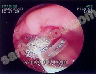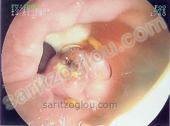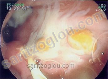 Σε συνέχεια του προηγούμενου ασθενή, φαίνεται η αφαίρεση των λίθων από τον χοληδόχο πόρο και η εκροή πυώδους περιεχομένου ως αποτέλεσμα της πυώδους χολαγγειίτιδας. Ενδοσκοπική εικόνα.