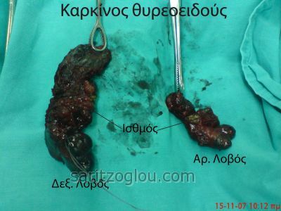 Εικόνες καρκίνου του θυρεοειδούς Καρκίνος θυρεοειδούς. Ο καρκίνος εντοπίζεται με την μορφή όζου στην μέση περίπου του δεξιού λοβού. Καρκίνος θυρεοειδούς. Διακρίνεται ο δεξιός λοβός και ο ατροφικός αριστερός λοβός.